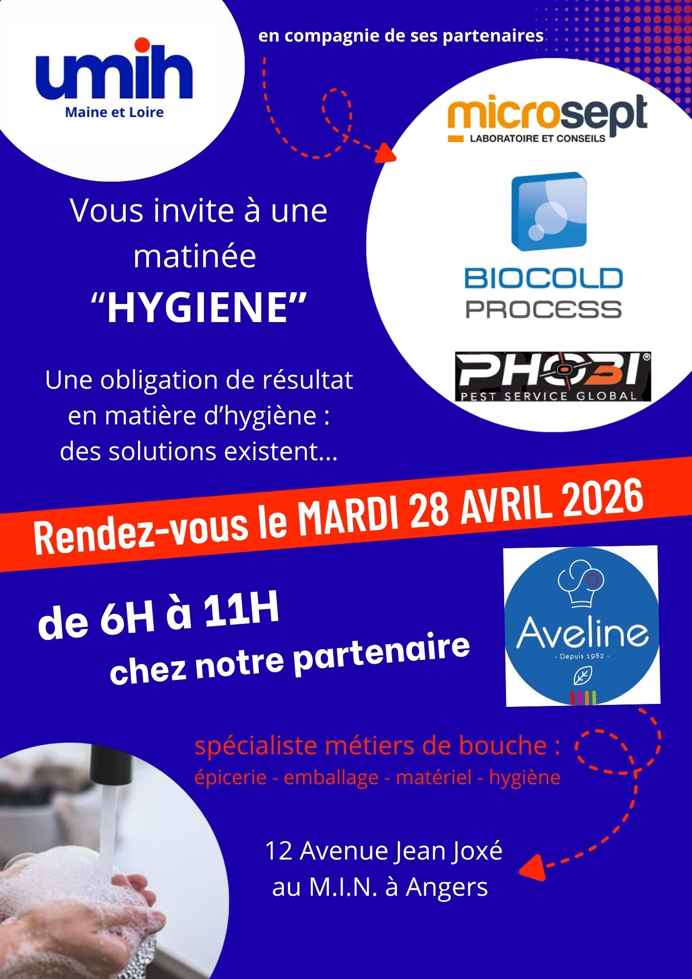 Le 28 Avril 2026, de 6H à 11H, dans les locaux de notre partenaire AVELINE, l'UMIH 49 convie les professionnels à une matinée d'échanges sur le thème de l'Hygiène.